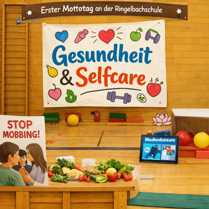 An der Ringelbachschule fand der erste Mottotag zum Thema Gesundheit und Selfcare statt. Die Schülerinnen und Schüler beschäftigten sich mit wichtigen Themen wie Bewegung, gesunder Ernährung, Medienkonsum, Mobbing und Stressmanagement. Dabei erhielten sie wertvolle Anregungen, wie sie ihren Alltag bewusster und gesünder gestalten können.