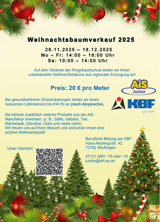Vom 28. November bis 18. Dezember 2025 können Sie bei uns auf dem Gelände der Ringelbachschule wunderschöne, unbehandelte Weihnachtsbäume aus regionaler Erzeugung erwerben.